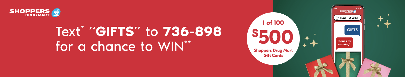 **THESE ARE NOT THE OFFICIAL RULES. NO PURCHASE NECESSARY. Open to legal residents of Canada age of majority or older within their province or territory of residence. Contest begins on November 15, 2025 at 12:00:01 AM ET and ends December 15, 2025 at 11:59:59 PM ET. For complete contest rules/entry details, visit www.shoppersdrugmart.ca/smscontest . 100 digital gift card prizes available to be won (ARV: $500 CDN EA). Must correctly answer mathematical skill-testing question. Odds of winning a prize depends on the number of eligible entries received by the end of the Week immediately preceding the applicable Weekly Draw Date. Weekly Draw Dates: November 18,25, December 2, 9,16, 2025.