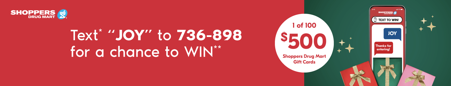 **THESE ARE NOT THE OFFICIAL RULES. NO PURCHASE NECESSARY. Open to legal residents of Canada age of majority or older within their province or territory of residence. Contest begins on November 15, 2025 at 12:00:01 AM ET and ends December 15, 2025 at 11:59:59 PM ET. For complete contest rules/entry details, visit www.shoppersdrugmart.ca/smscontest . 100 digital gift card prizes available to be won (ARV: $500 CDN EA). Must correctly answer mathematical skill-testing question. Odds of winning a prize depends on the number of eligible entries received by the end of the Week immediately preceding the applicable Weekly Draw Date. Weekly Draw Dates: November 18,25, December 2, 9,16, 2025.